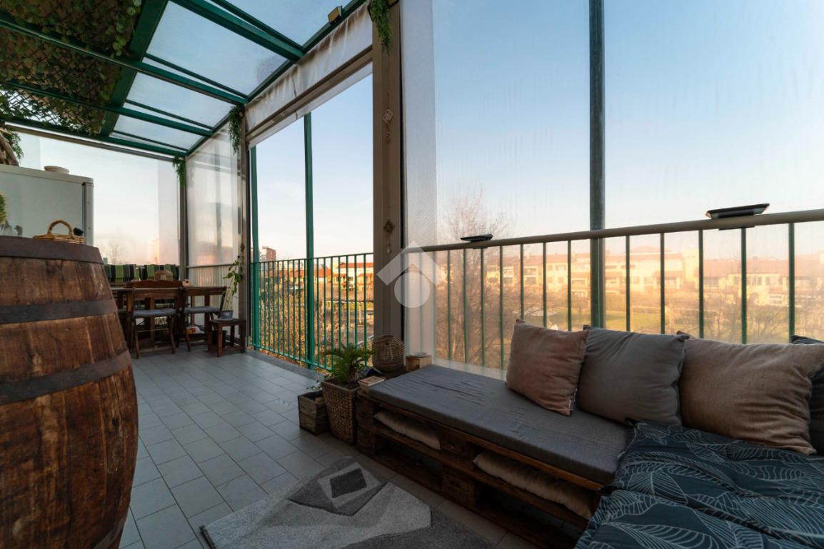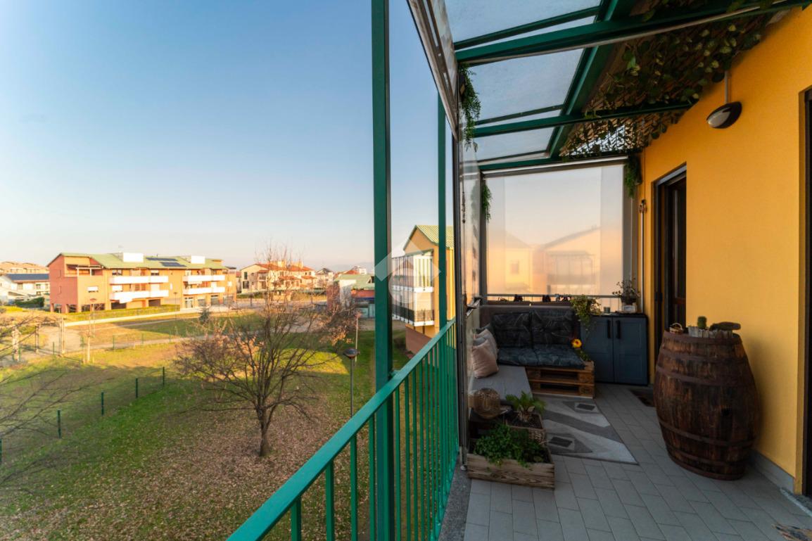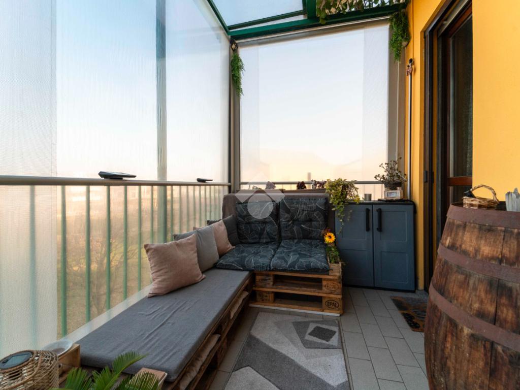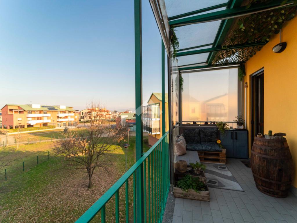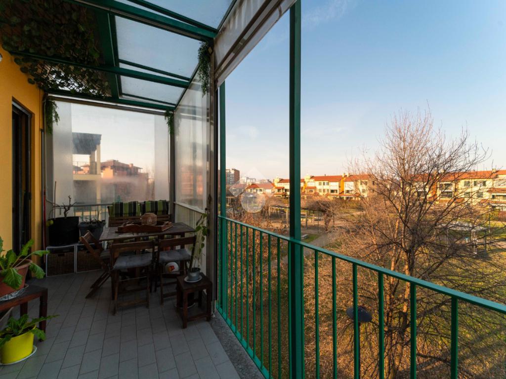 Il vero valore aggiunto è l’ampio terrazzo, accessibile dalla zona giorno, da un bagno e dalla camera da letto: uno spazio all’aperto con vista sul parco, ideale per colazioni, cene o semplici attimi di relax immersi nel verde.